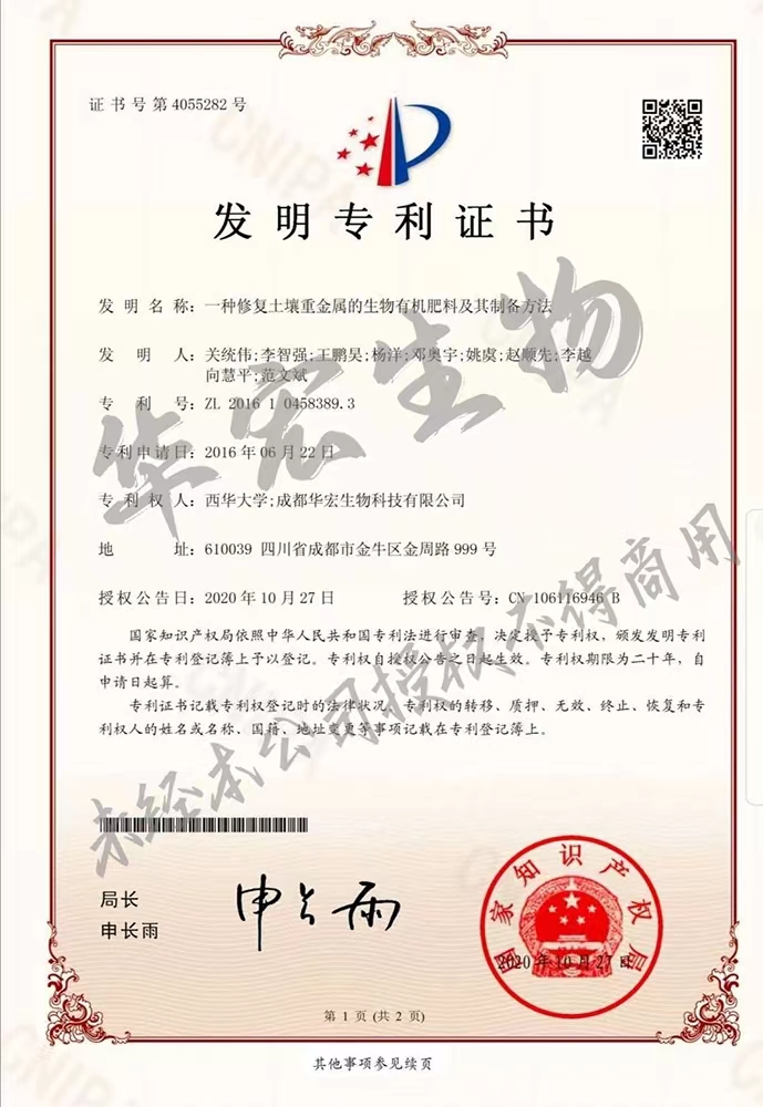 • 一種修復土壤重金屬的生物有機肥料及其制備方法專利證書